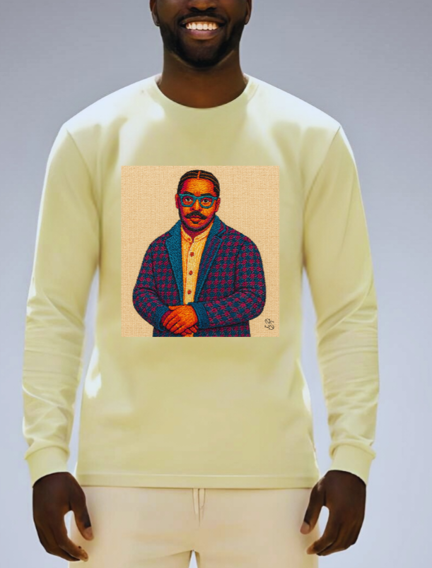 Bright, soft, and soulfully radiant, the “Sunlit Testament” sweatshirt wraps your story in warmth. The lemon chiffon base glows like Southern morning light, casting the embroidery-style graphic in a golden aura. With thread-like strokes and blue and crimson era elegance, the design honors visionary creators who reimagine horror through afro-surrealist cinema.