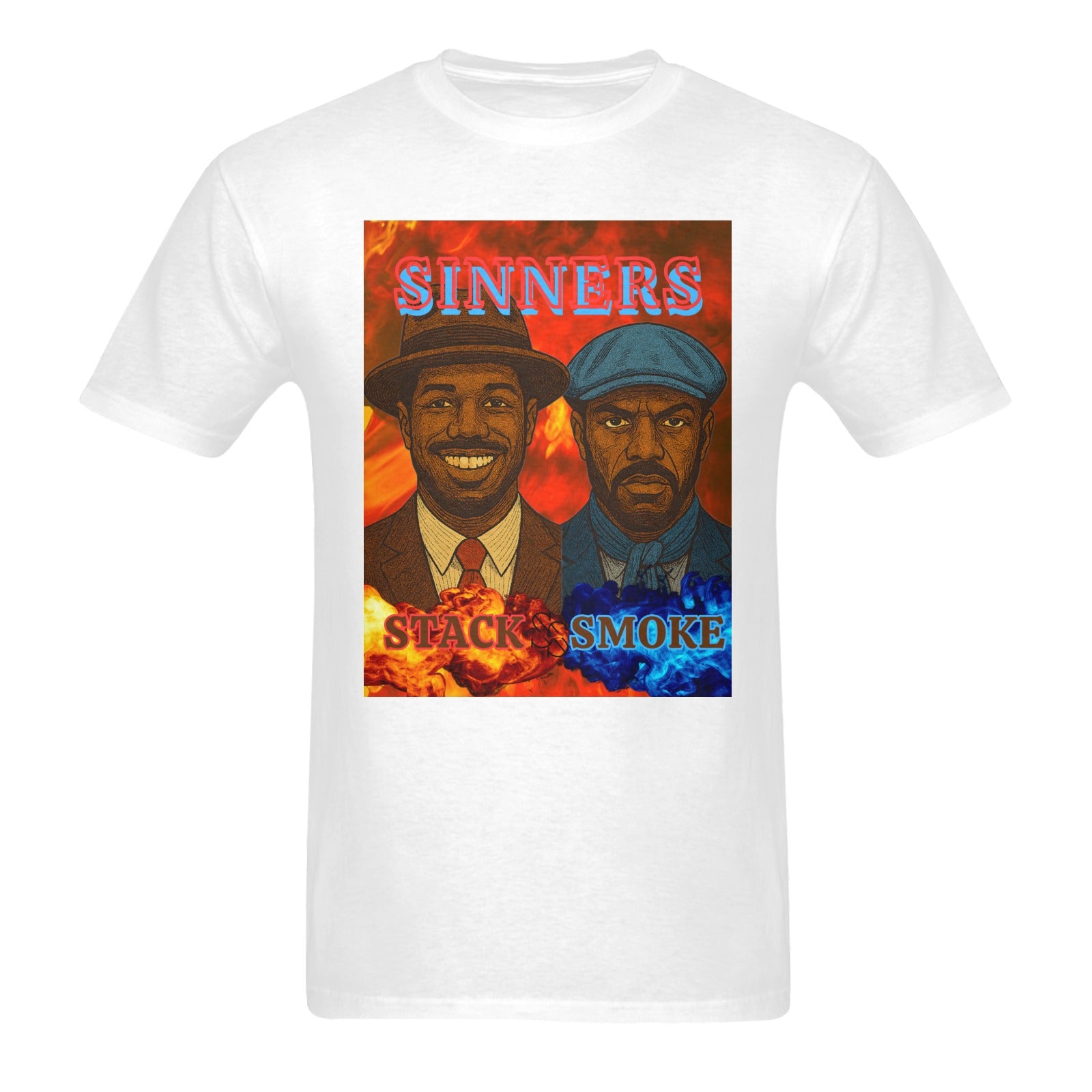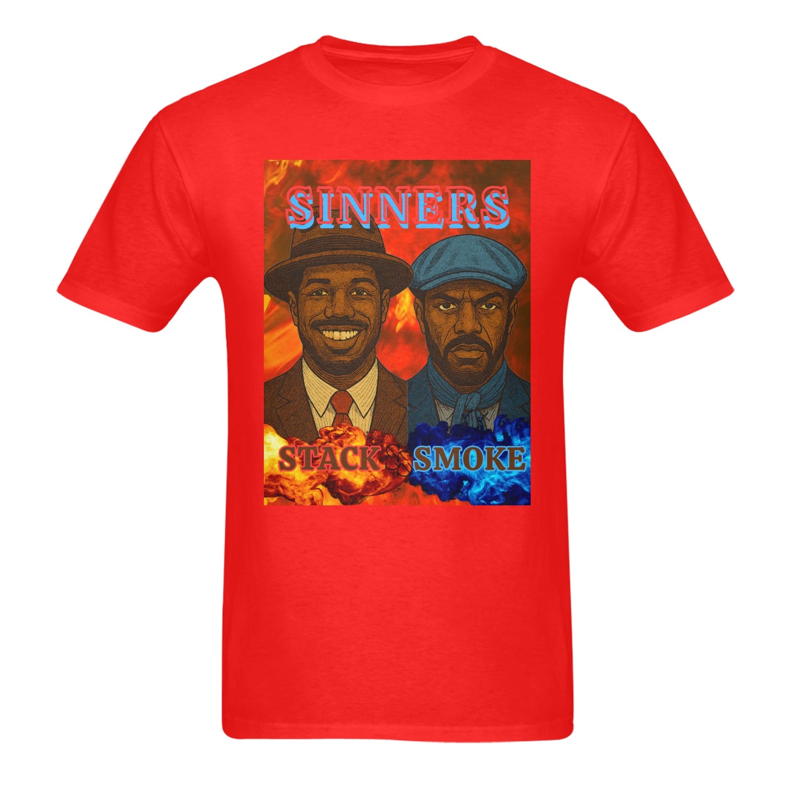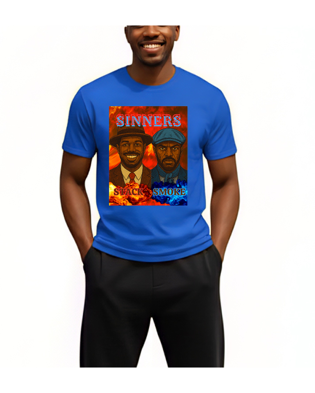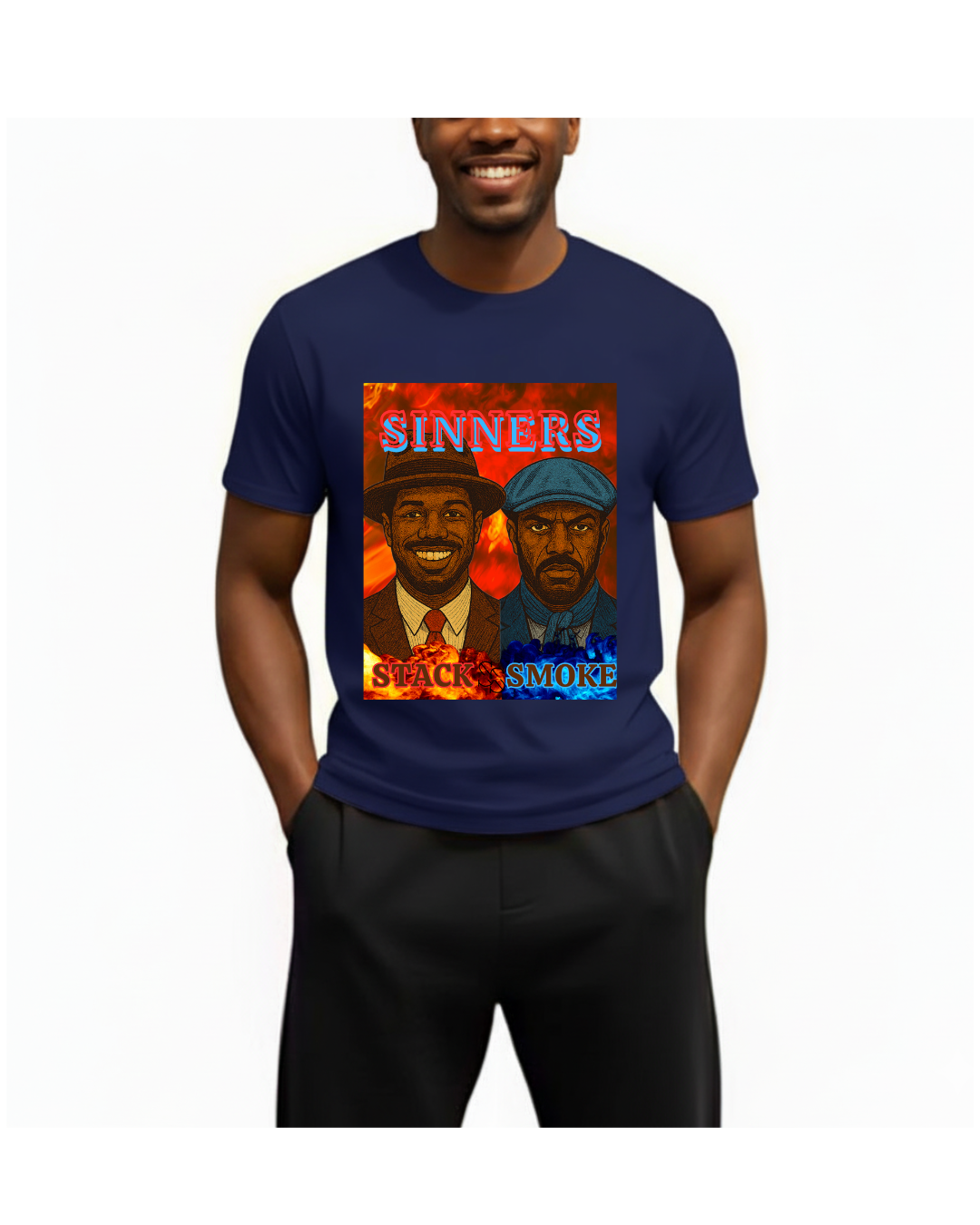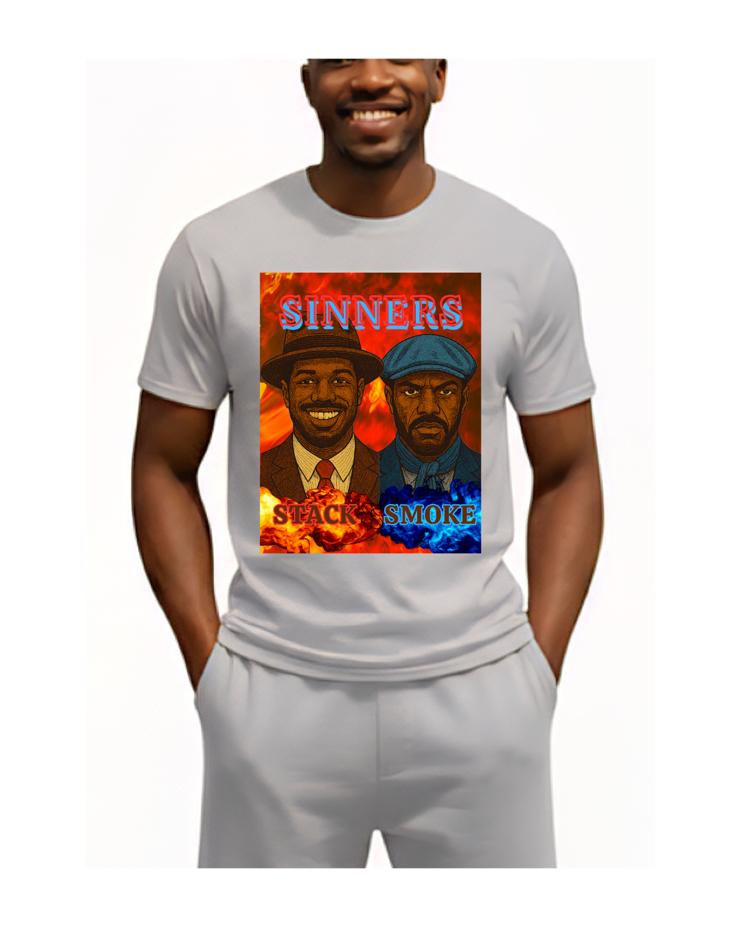 From the fictional universe of Sinners comes “Twin Flame”—a stylized tribute to two iconic figures bound by legacy and myth. This tee features a graphic parody of Stack and Smoke rendered in bold, vintage poster style with cross-hatching, stippling, and rich color contrast. Set against a warm yellow-orange gradient and framed by bold red lettering, this design blends afro-surrealist symbolism with cultural parody.